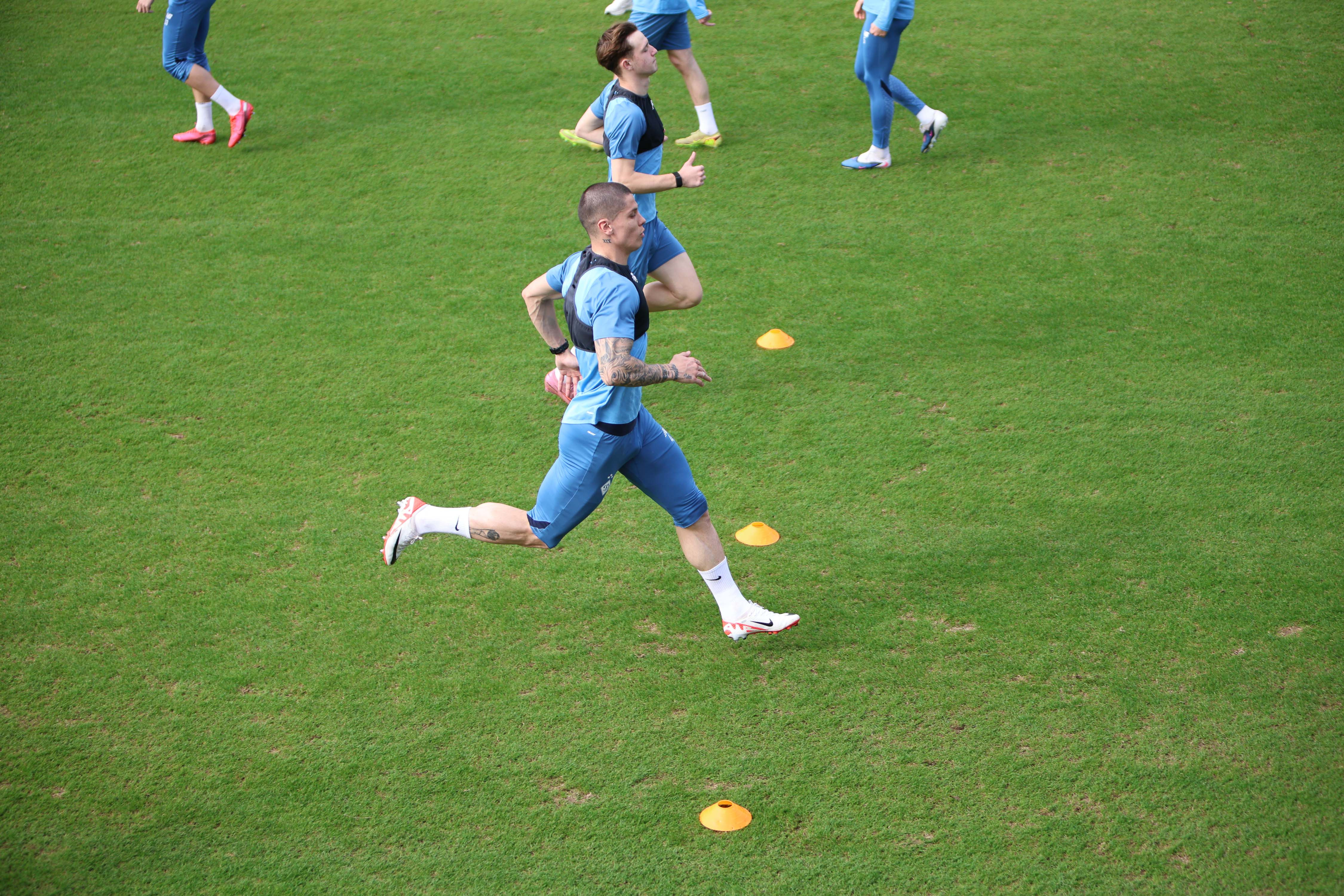Практичне заняття почалося з інтенсивної розминки, під час якої гравці по черзі оббігали тренувальні стійки та рухались у напрямку, позначеному фішками. Далі була вправа на реакцію. Розбиті по парах, футболісти реагували на команди, а в певний несподіваний момент один гравець мав тікати до лінії, а інший його наздоганяти.